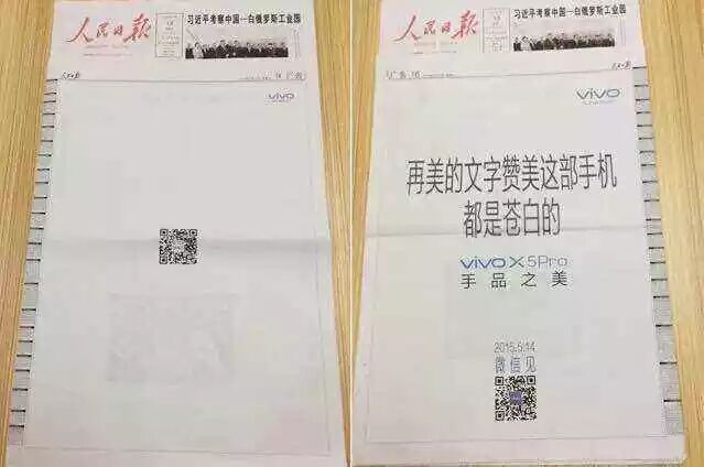VIVO霸气地承包了人民日报的四个版面,前三版都只放了一个小小的二维码,其余部分全部留白;到第四版高贵冷艳地抛出一句“再美的文字赞美这部手机都是苍白的”。