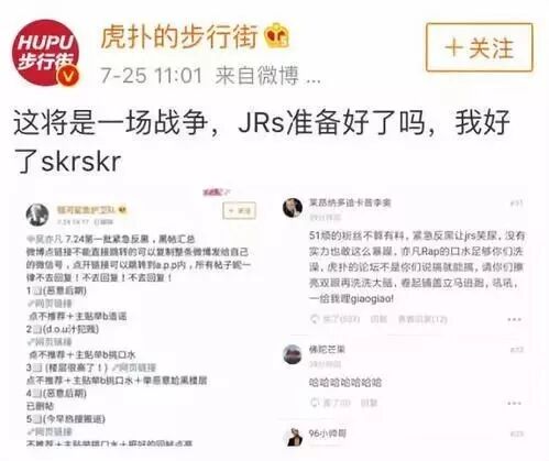 随后,迎来了凡凡粉丝的第二轮凶猛反击,这轮反击被定性为“吴亦凡护卫队微博召集铁粉试图入侵虎扑”。11:01,虎扑正式宣战:“这将是一场战争,JRs准备好了吗,我好了skrskr。 ”