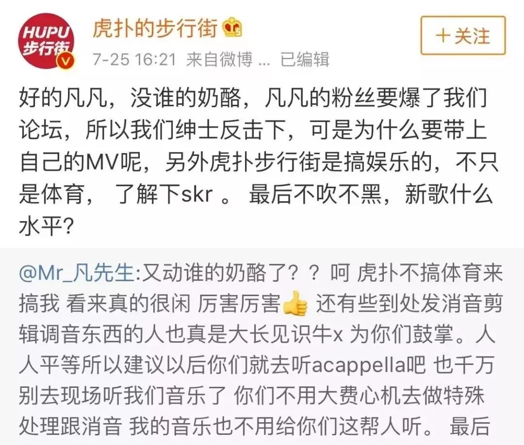 16:15,凡凡亲身应战,“又动谁的奶酪了”“虎扑不搞体育来搞我”,至此,66万JRs(虎扑用户代称)VS 3200万梅格妮(凡凡粉丝代称)的战争全面触发,这场实力悬殊的较量史称“撕逼界的赤壁之战”。
