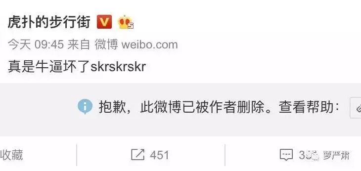 经过凡凡粉丝一晚屠戮后,25日9:45,官微“虎扑的步行街”到微博上“晒尸体”(指被举报删除的微博),配以“吵架吵不过,请大家评评理”的直男文体—“真是牛逼坏了”。