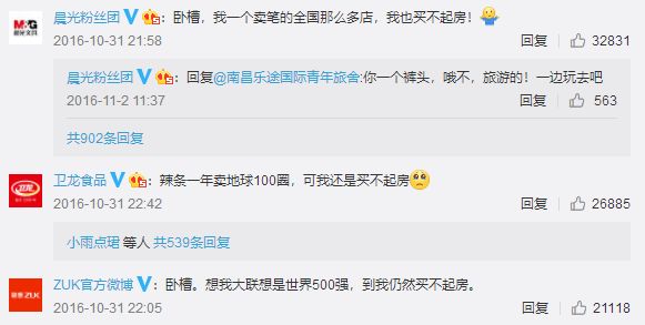 引得晨光、卫龙、娃哈哈等一众官博纷纷留言“我也买不起房”,“买不起房体”一时间火遍社交网络,获得百万曝光。