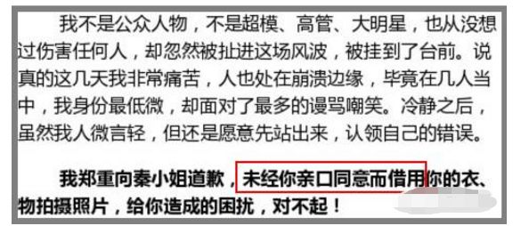首先呢,她承认了自己是有穿秦舒培的衣服的,也郑重向秦舒培道了歉。
