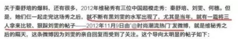 这件事呢,就要从四大国模撕X时期说起了,2012年,秦舒培、刘雯、何穗一起登上维秘秀。维密秀结束之后,网上就突然出现了一大票黑刘雯的水军。