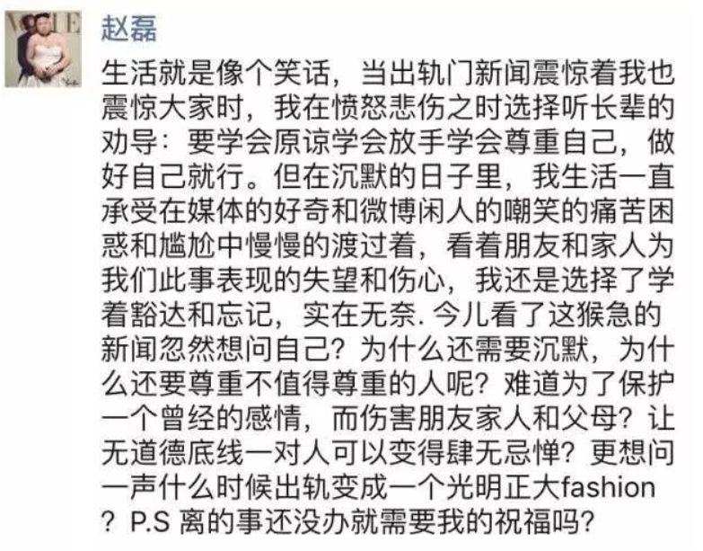 赵磊的这条朋友圈文字还挺长的,给大家画一下重点吼:1、他和秦舒培还没有离婚 2、讽刺秦舒培陈冠希俩人“没有道德底线”。