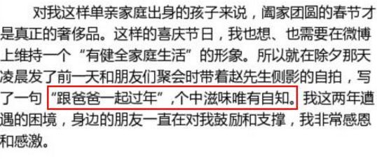 大姨觉得啊,这小姑娘因为从小缺少父爱,所以用了跟赵磊的合照在过年期间发微博假装自己有爸爸这事儿呢,其实挺让人同情的。