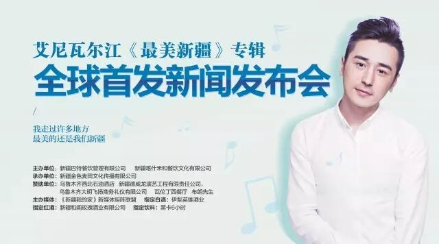 8月10日,由新疆巴特尔餐饮管理有限公司、新疆喀什禾和餐饮文化有限公司联合主办的新疆流行音乐代表性歌手、新疆歌颂民族团结之星“艾尼瓦尔江新专辑《最美新疆》全球首发新闻发布”会取得圆满成功。全国近百家媒体聚焦本次盛会,中国音乐协会副主席努斯莱提·瓦吉丁、著名书法家陶然等众多重量级大咖、全国近百位成功企业家、数十位明星艺人出席发布会,数十位当红网络主播大咖齐聚现场全网直播,共同见证艾尼瓦尔江《最美新疆》的全球首发!