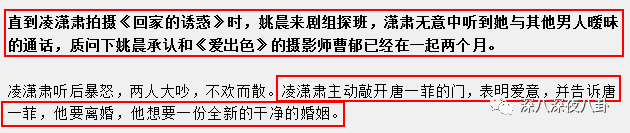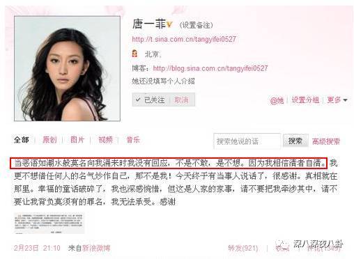 但事实好像并不只是出轨男与小三修成正果的戏码,11年2月23号,在凌潇肃和姚晨离婚一个月以后,唐一菲发微博,似乎在澄清自己不是小三