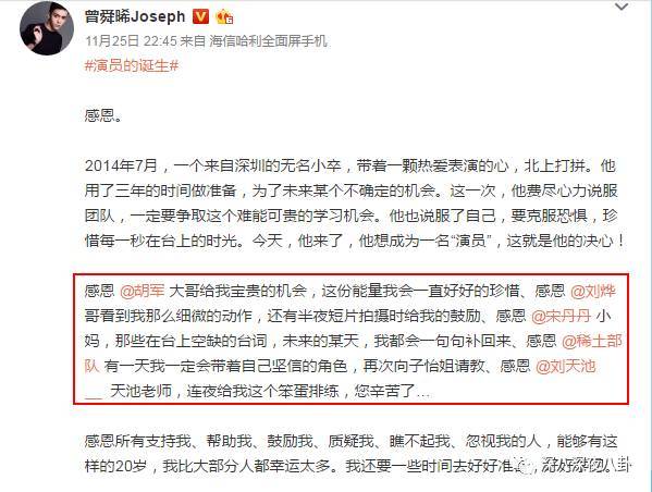 这个新晋演员曾舜晞也是发了长长的一条微博。虽然这次表演的不太好,还是要看以后努力啦