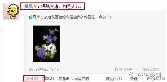 当天晚上,姚晨转发了一条自己写于2009年的微博,照片中是凌潇肃从西藏给她带回来的格桑花,她写道:“满纸荒唐,物是人非。”