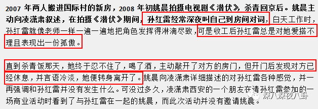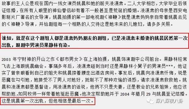 文章里面讲,姚晨在同凌潇肃的婚姻很早之前就已经存在出轨行为,先后同4名男子相好!第一次出轨还是在两个人没有结婚的时候↓