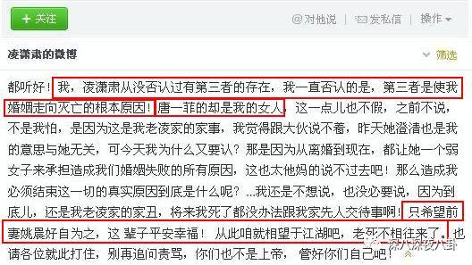 25号晚上,凌潇肃发了微博,亲口承认小三的存在。。。【唐一菲是我的女人】
