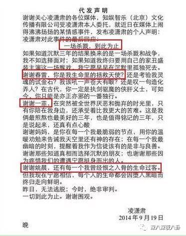 19号凌潇肃发表了声明,里面说“一切杀戮,到此为止”,说了自己三年的隐忍,好像还把姚晨比为“曾经恨之入骨的生命过客”