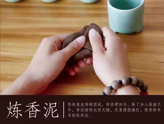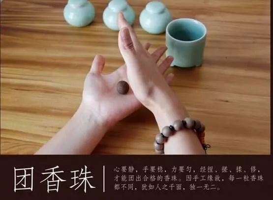 把炼好的香泥团成珠子,如果揉搓的过程中遇见干裂的情况,在手心沾点水即可。