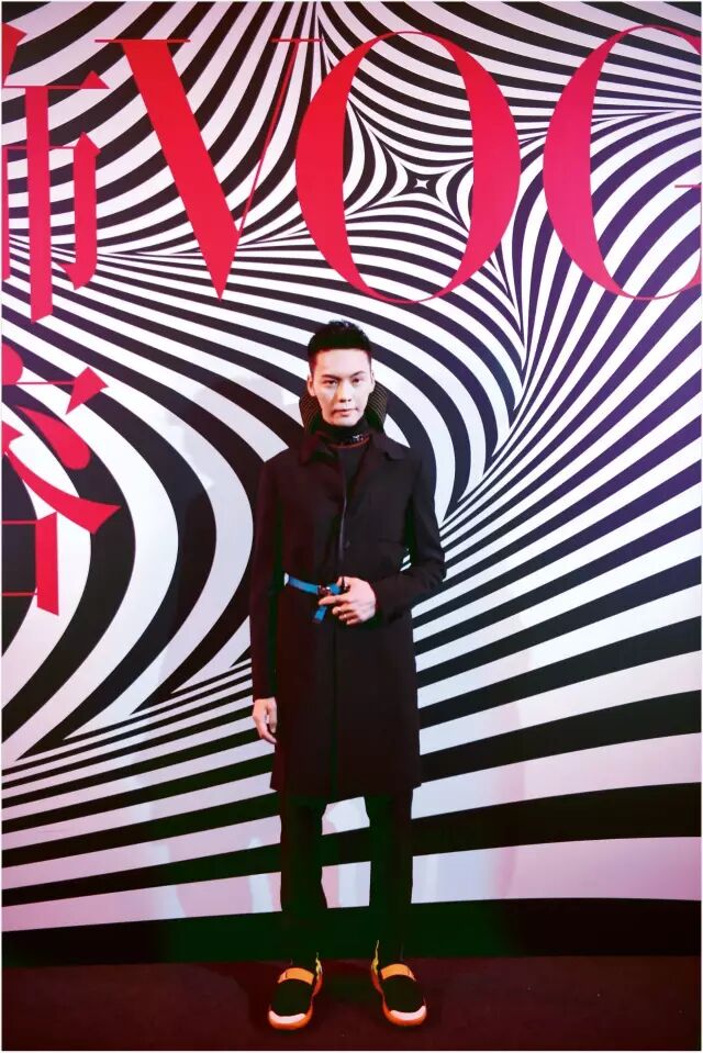 陈伟霆身着Prada 2017春夏系列黑色西服套装内搭高领无袖针织衫,搭配蓝色尼龙腰带及撞色高帮运动鞋,出席于2016年11月3日VOGUE在北京举办的11周年派对。