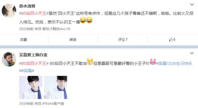 各家粉丝为保护爱豆都严词拒绝“天王”这样的高帽子,确实,四个孩子都还嫩着呢,当着圈里众多前辈大佬被冠上“小天王”的称号,是嫌弃自己的前途太好吗?