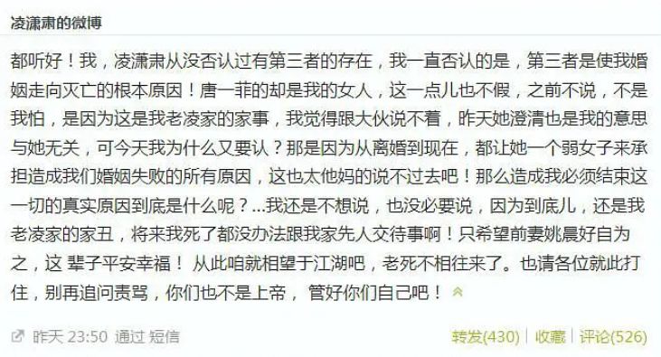 他发微博说自己确实在婚内爱上了唐一菲,但造成他与姚晨婚姻破灭的真正原因,却不是这件事(经纪人表示,凌潇肃是被盗号了)。