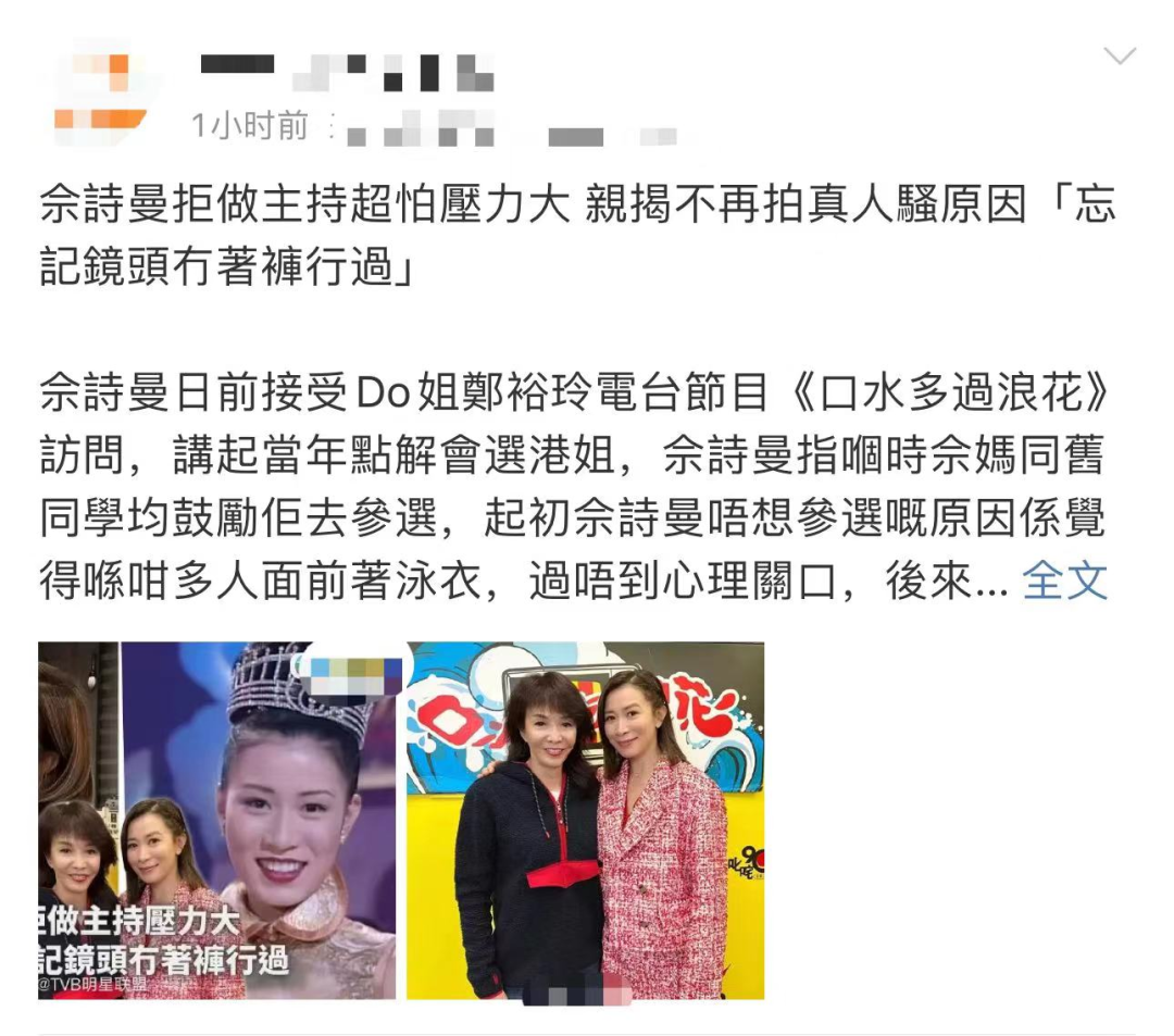 2月17日,据媒体报道,佘诗曼回到香港参加了郑裕玲的访谈节目《口水多过浪花》,罕见透露自己时隔6年返回TVB拍戏的原因,还吐槽了内地真人秀节目,引起不小的争议。
