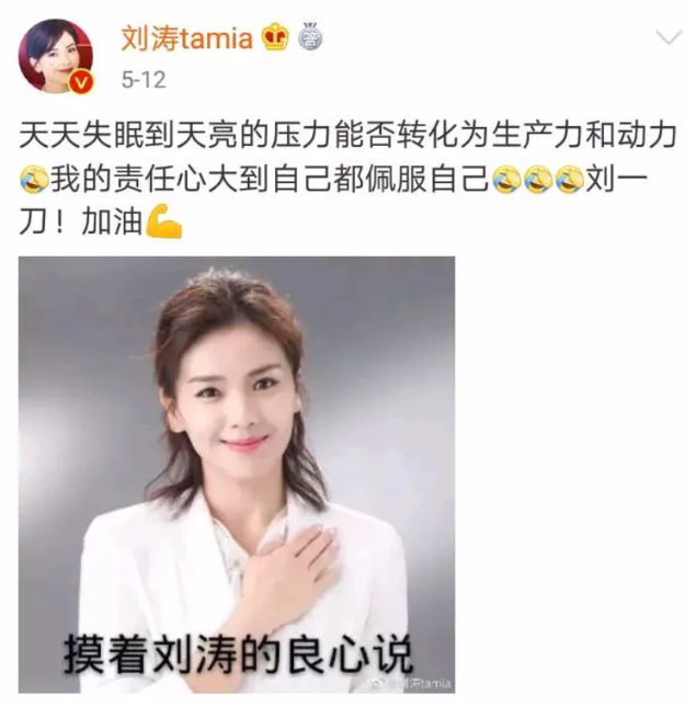 拿前段时间深夜发文的刘涛举例,她在自己微博表达了近期生活的无力感→