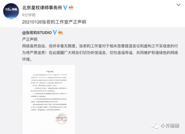 声明中点名一些发布用户在多个平台散播虚假言论,导致不明真相的网络用户转载评论,影响张若昀的声誉,文中明确指出“耍大牌”等言论与事实严重不符,系恶意造谣抹黑。