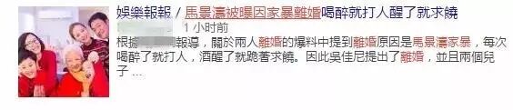 于是一时之间,关于马景涛离婚的理由变得扑朔迷离,有媒体爆料离婚的原因是家暴,指“马景涛每次醉酒就会打人,酒醒后又跪着求原谅”