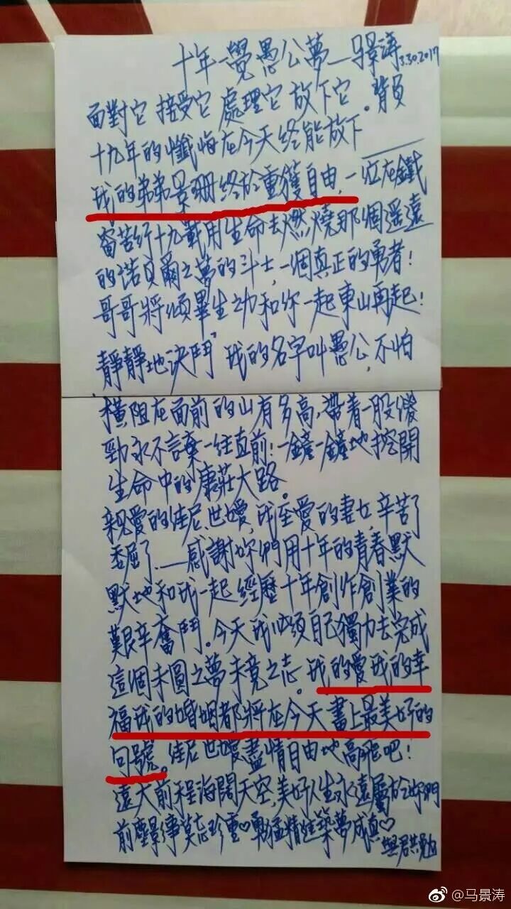 但!是!马景涛紧接着却写道:“亲爱的佳尼、世嫒,我至爱的妻女辛苦了委屈了……今天我必须自己独立去完成这个未圆之梦未竟之志。”