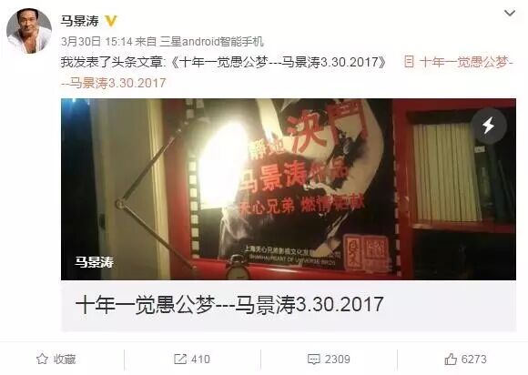 昨天下午,马景涛在微博发布了一则长文章《十年一觉愚公梦》
