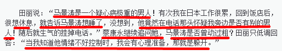 而在04年蔡康永的访问中,回忆起自己与马景涛相恋的过程时,田丽也称“马景涛疑心病很重,会很生气地挂掉电话”。而当蔡康永追问,马景涛是否动过粗。田丽则讳莫如深地表示,“当我知道他情绪不好控制时,会躲开。”