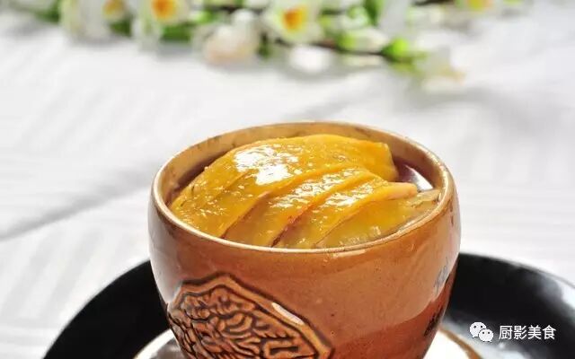 特点:色泽金黄,淡淡的茶香味。鸡的香味体现的淋漓尽致。