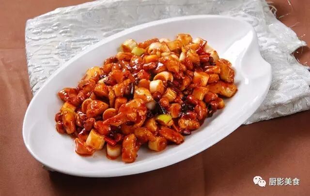宫保鸡丁选用鸡肉为主料,佐以花生米、黄瓜、辣椒等辅料烹制而成。 红而不辣、辣而不猛、香辣味浓、肉质滑脆。由于其入口鲜辣,鸡肉的鲜嫩配合花生的香脆。