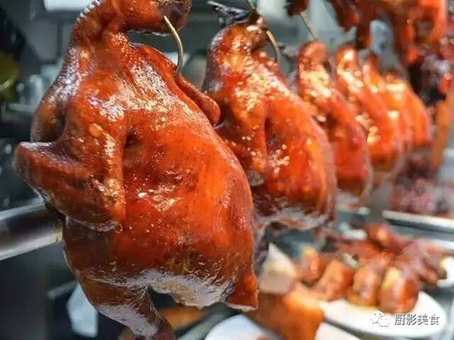 3.鸡洗净、沥干水分,用腌渍料浸渍1 2小时(天冷需更长时间,夏天应放在冰箱冷藏室里)。然后放开水中烫一下,取出,刷上薄薄一层糖浆,吊风口处,待皮稍吹干,放烤箱中烤熟,取出。