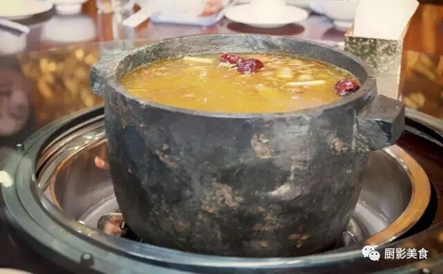 炖鸡用的石锅是用一种叫做“皂石”的云母石砍凿而成,而这种石头仅产于墨脱,要靠背夫从墨脱把原始石材背出来后,再由门巴族人用整块石材手工细 心凿制,加工时要求下手力道匀称,一旦心急,皂石立被凿穿,所以这种石锅售价也非常昂贵。墨绿色的云母石锅,保温性特别好,而且据说富含镁铁等17种矿物微量元素。