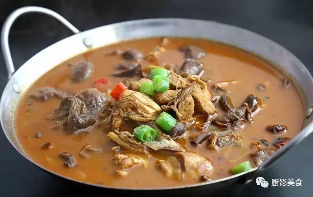 通常是用干蘑菇、鸡肉和粉条一同炖制而成。榛蘑可以衬托出鸡肉的鲜香,粉条滑爽而绵实。