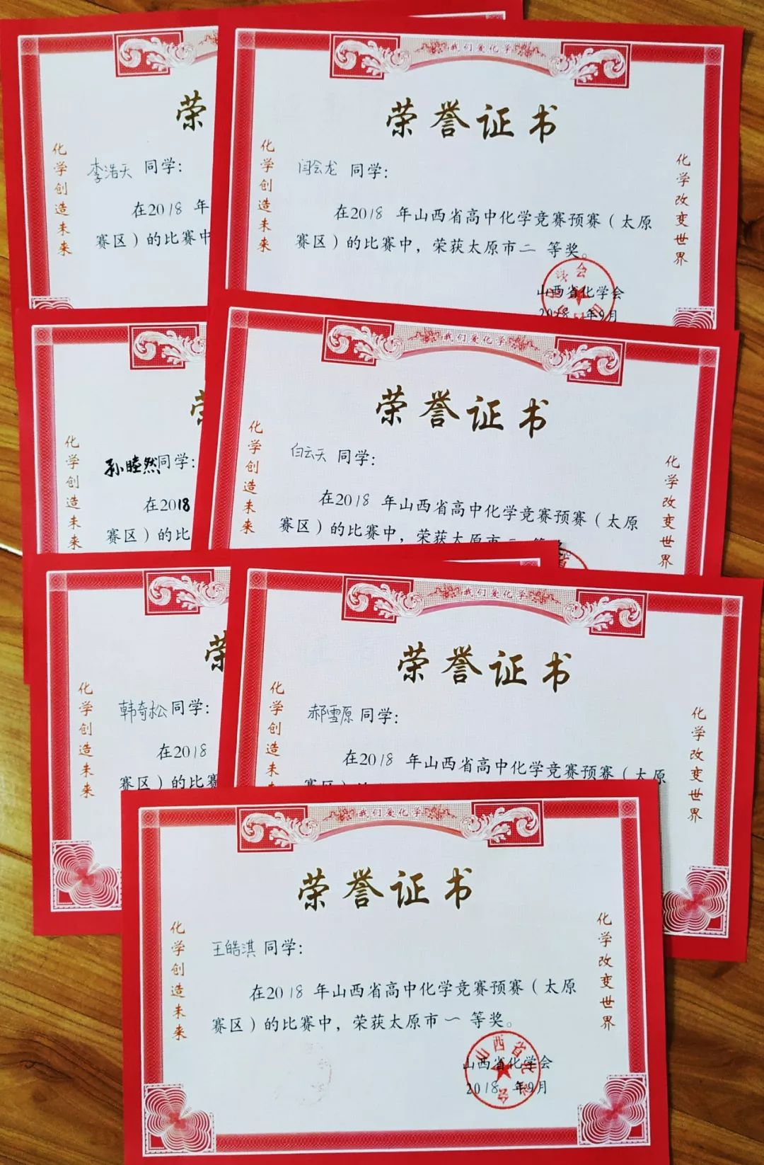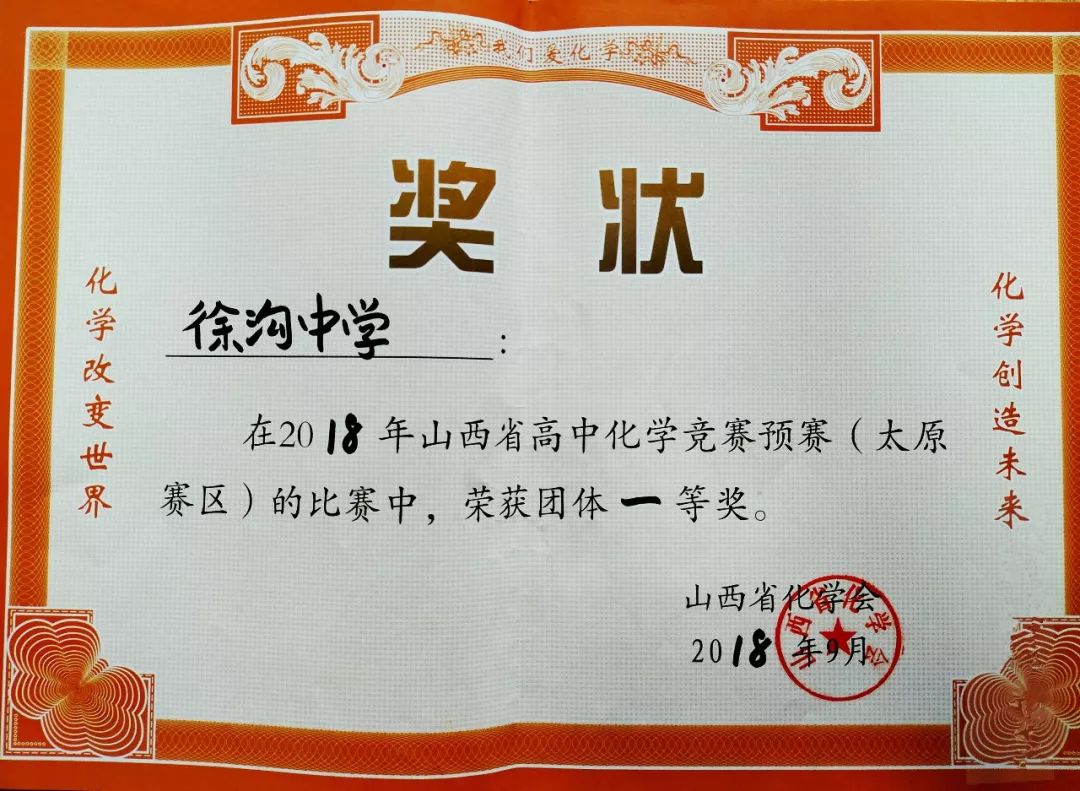在2018年山西省高中化学竞赛预赛中,我校参赛学子经过激烈角逐,喜获佳绩。徐沟中学荣获团体一等奖,20名同学获得一等奖,16名同学获得二等奖,4名同学获得三等奖。金河中学获得一等奖1人,二等奖3人,三等奖3人,希望同学们以他们为榜样,努力学习,勇攀高峰。