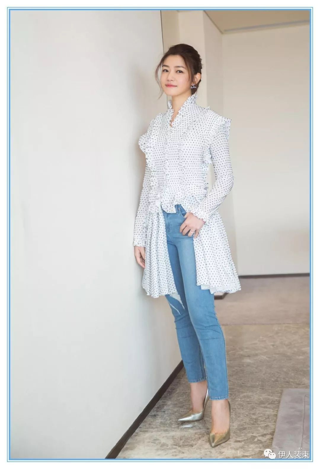 一件白色小波点的上衣,花边的设计淑女范十足。剪裁十分合身,勾勒出她凹凸有致的身材。下搭蓝色牛仔裤,双腿又细又直,脚踩金色高跟鞋,多了几分女性的优雅与干练。一身穿搭可以说非常适合陈妍希的气质了。