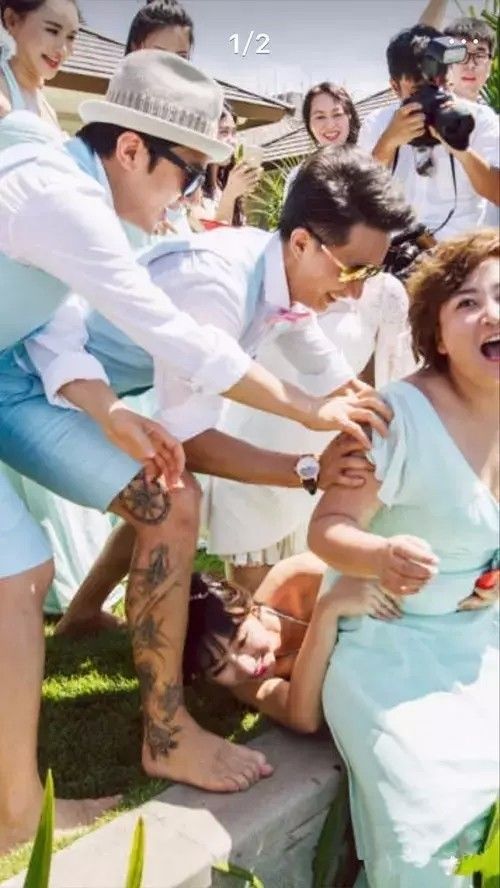 最后还是贾玲挡在前面,柳岩才没被扔下泳池。
