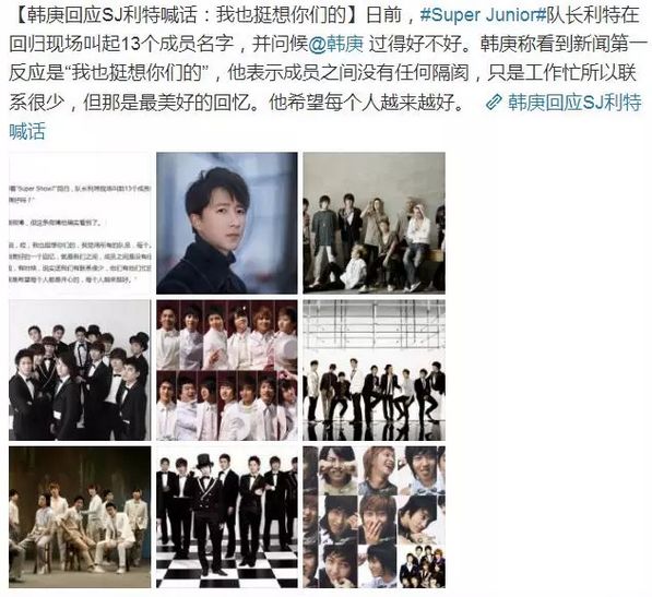 去年12月底,sj回归,韩庚在看见队长喊话的新闻后立马做出了回应,说自己也挺想他们的。