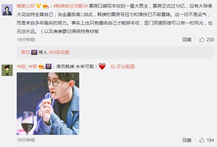 这次韩庚新电影口碑票房双丰收,评论里粉丝是一脸高兴,纷纷表示“以后请叫我十亿男主粉”,“苦尽甘来”...甚至有粉丝声泪俱下的总结韩庚演艺之路的艰辛...