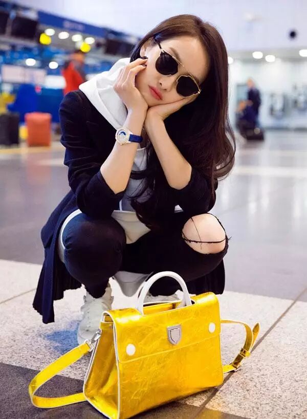 机场照的宋茜穿着打扮上也以低调为主,但也抵挡不住她的女神气质,白色连帽卫衣搭配黑色外套,加上黑色破洞九分裤,很闲适悠然的装扮,黄色的包包成为了整体的一大亮点。