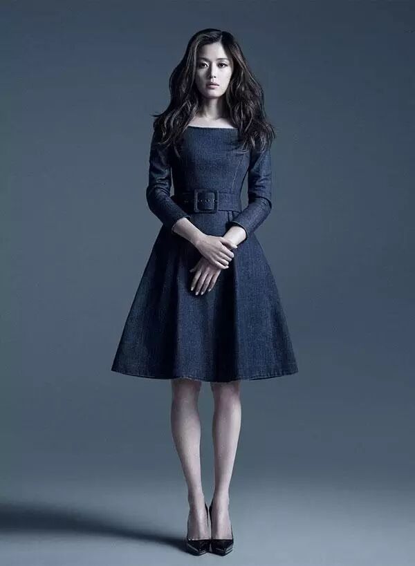 牛仔的一字领连衣裙透出了沉静与内敛的效果,修身与大大的裙摆,衬出了全智贤的优雅、端庄的魅力。