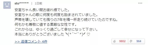 安室ちゃん一直以来辛苦了。你的歌无数次激励了我。声带受损后的这7年尽全力坚持到了最后。是各个方面都值得尊敬的伟大女性。今后可以放松地生活,一定要幸福啊。真的很感谢你╰(*´︶`*)╯♡