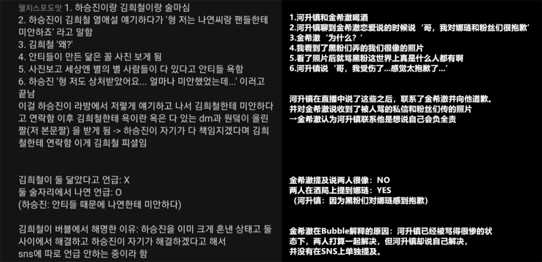 金希澈陷入争议?被传酒后取笑女友Momo的TWICE队友? 韩国me2day 日韩男星 2020-09-10 16:39:36 549 创作不易,用心坚持,欢迎请BaGua喝几杯爱心咖啡!打赏并支持本文 打赏并删除本文 众所周知,艺人的一言一行都备受大众的关注,稍有不慎就会引起争议。当然如果艺人朋友提及了艺人的私事也同样是如此。最近SM艺人金希澈就因为朋友的提及而卷入了争议之中,其中还牵连到了TWICE成员Momo和娜琏...今天我们一起来了解一下这件事的来龙去脉。昨日,某网友在韩网the qoo上传了一篇题为《目前对争议有立场差异的金希澈和河升镇》的热帖。据帖主表示,前篮球选手河升镇最近在油管直播中提到:“我不久前和希澈哥一起喝酒了,大家都知道希澈哥和谁在谈恋爱吧?反正他在酒桌上给我看了娜琏的照片,还开玩笑说(娜琏)和我长得很像”。这段对话内容在SNS和网络社区传播后受到了大众的谴责,TWICE的粉丝们指责河升镇提及成员们的真实姓名是轻率的行为,金希澈的粉丝们也指责将私人对话直接公开在节目中的行为不妥。随后河升镇上传了道歉信,不过因为争议愈演愈烈,道歉信也引起了热议,目前河升镇已将道歉信删除。另外,帖主还表示金希澈曾在私密聊天工具“Bubble”中否认了河升镇说法,但因为Bubble禁止内容流出所以没有截图,也无法详述。因此,大多数网友对争议中无辜被牵连的人表示:“娜琏最可怜”...不过也有推特网友截图了Bubble的内容,据截图显示金希澈在Bubble中对河升镇的说法进行了否认,还表示两人喝得太醉,其实根本记不清当时具体说了什么。此外,也有其他网友整理了此事的详细经过,我们一起来看一下。首先该网友列出了两人的谈话内容,并表示河升镇在直播后向金希澈进行了道歉。1.河升镇和金希澈喝酒2.河升镇聊到金希澈恋爱说的时候说‘哥,我对娜琏和粉丝们很抱歉’3.金希澈‘为什么?’4.我看到了黑粉们弄的我们很像的照片5.看了照片后就骂黑粉这世界上真是什么人都有啊6.河升镇说‘哥,我受伤了...感觉太抱歉了...’之后该网友还表示,金希澈提及说两人很像的内容不是事实,但两人在酒局上提到娜琏的内容是事实。而这是河升镇因黑粉们对娜琏感到抱歉所以才提到的。最后对于金希澈在Bubble上解释的原因,该网友表示:河升镇已经被骂得很惨的状态下,两人打算一起解决,但河升镇却说要自己解决。河升镇原是篮球选手,他在退役后出演了各种综艺节目。最近他开通了个人YouTube频道,与粉丝们进行沟通。想象一下(长按图片识别图中二维码观看视频) 创作不易,用心坚持,欢迎请BaGua喝几杯爱心咖啡!打赏并支持本文 打赏并删除本文 感谢您的支持鼓励,我会继续努力的!文章地址:用户邮箱:打赏金额:USDT 请输入数字点击”去打赏“,即可进行打赏支持本文章哦 金希澈 About the Author 韩国me2day 功能介绍:新浪微博@韩国me2day专属帐号,合作联系:[email protected] Related Posts 这对明星夫妇结婚六年恩爱如初还有这样的秘诀... 2023-06-05 17:00:49 李钟硕&李宝英合影-吴世勋新剧海报-郑号锡入伍-(G)I-DLE、ONEUS 5月回归-韩素希ins图-安宥真&李泳知-泰民 2023-04-13 20:10:56 李钟硕IU均承认恋情-IU本人发文-iKON完整体签约新社-EXO回归-都暻秀-JISOO solo 2023-01-01 16:28:01 朴信惠复出-KBS歌谣大祝祭-SMTOWN-WayV-Haerin-秀彬-珉豪-金秋天-Somi-罗英锡 2022-11-30 17:12:59 曾经的韩流男星已经两年没拍戏,可他一家五口过得超幸福... 2022-11-22 18:06:57 发表评论
