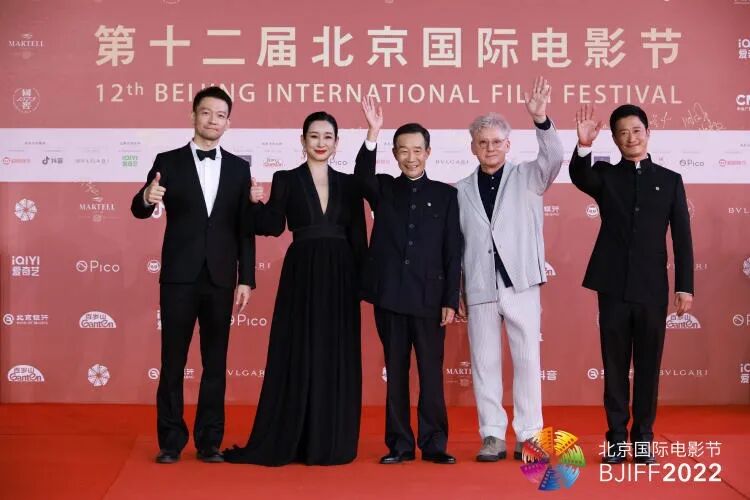 2022 年8 月12日,北京。第十二届北京国际电影节开幕红毯。“天坛奖”评委会成员(从左至右)吴京、秦海璐、李雪健、柯文思、郭帆出席。(图/ 视觉中国)