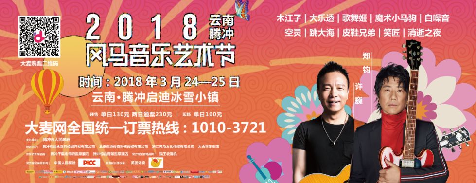 2018云南腾冲风马音乐艺术节将在3月24日、25日在云南腾冲拉开帷幕。风马音乐节是由国内著名音乐艺术家、知名音乐人郑钧老师创建的,本次由腾冲市人民政府主办,云南启迪、风马文化、启迪影视、太合音乐集团联合主办。风马音乐节融合了民族+时尚的文化血液,最具年轻人喜欢的影响力明星阵容,展现少数民族文化精粹内容,结合云南腾冲现有的自然风景生态旅游文化圈,带给时下年轻人一个全新的视听体验。音乐、民族市集、互动游戏、生态旅行、异域美食专区等为你打造丰富多元的音乐狂欢盛宴。