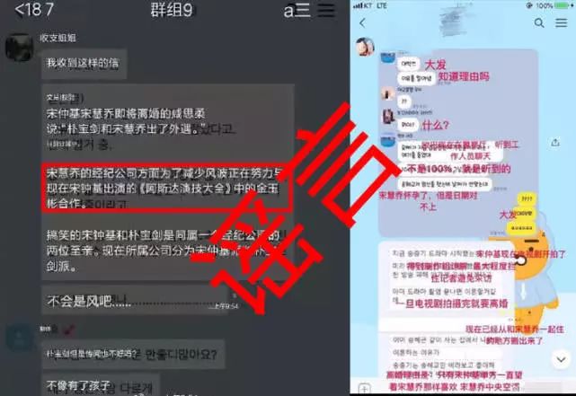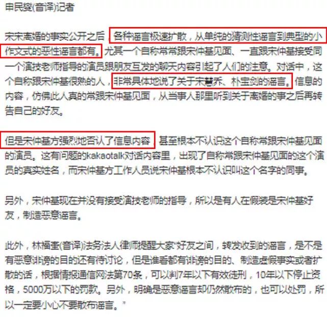 报道显示在离婚公开之后“各种谣言极速扩散”并且已经改变了性质,由“猜测性”变成了“恶意散布”,而宋仲基方特别针对有关宋慧乔的出轨传闻,特别是其与朴宝剑的谣言进行了澄清。并且“强烈地否认了”传播谣言的“信息内容”。