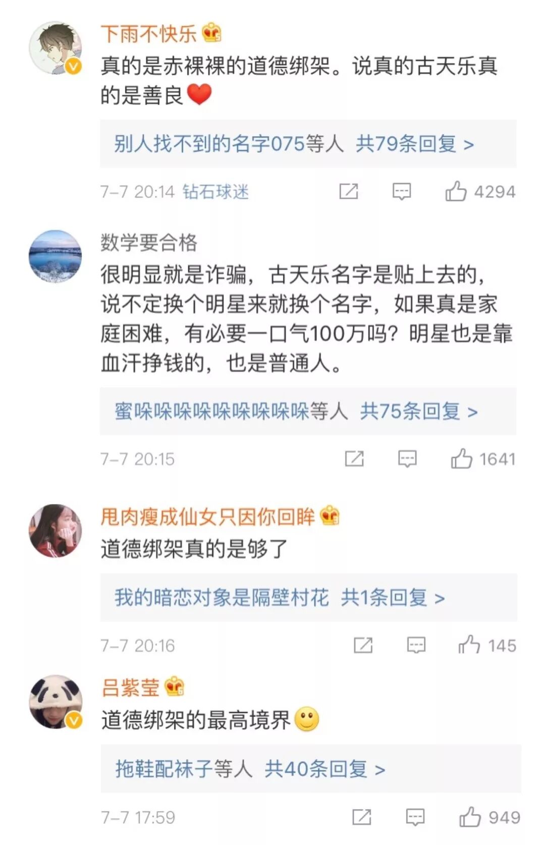 这则新闻一出,很多网友都气愤不已,虽然古天乐热衷于公益,可开口就是一百万,这就是明晃晃的道德绑架啊!