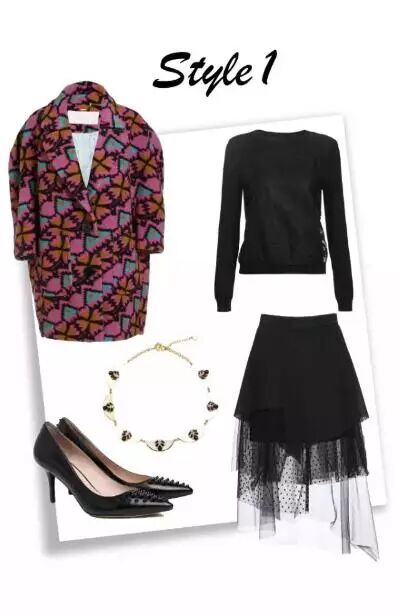 色彩明媚的印花大衣+飘逸的黑纱裙将射手座女孩天真烂漫、活泼开朗的个性演绎得淋漓尽致,尽显清新灵动。