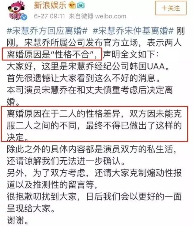 虽然离婚的原因众说纷纭,我们不得而知;但是宋慧乔的离婚声明中的“性格不合”却是我们很多人最后分手都会归结到的原因。