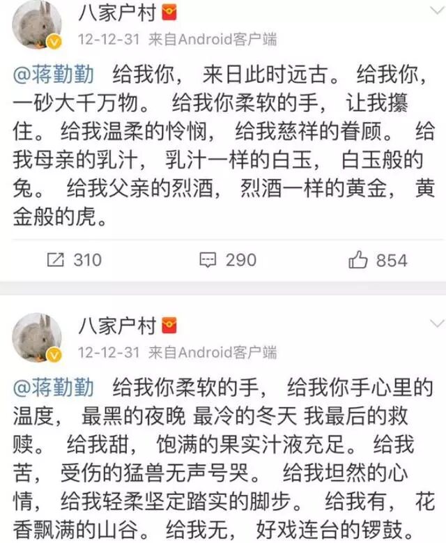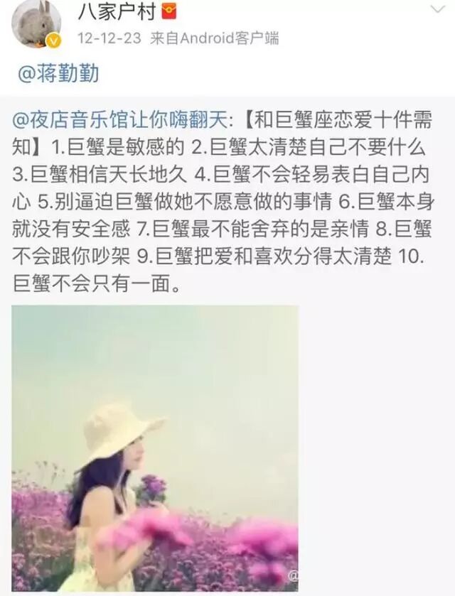 转发“和巨蟹座恋爱十件需知”的微博并艾特蒋勤勤,没有想到大叔也有一颗敏感细腻的心!这哪里像相处了十几年的老夫老妻,明明是热恋中的情侣嘛!