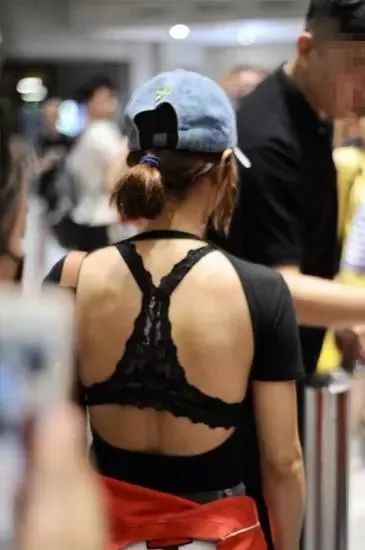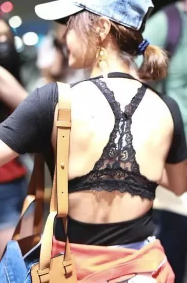 天哪!大露背!还是内衣外穿!黑色蕾丝的内衣带子整个都裸露在了外面。