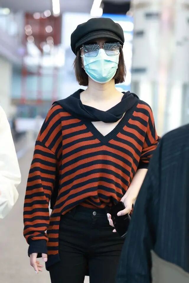 对于瘦一点的姑娘来说,横纹是非常友好的时尚元素,还能够丰富整个造型的色彩感。就像王珞丹穿的横纹针织衫,简单搭配黑色小脚裤和短靴,就显得格外时尚又显腿细。特别是头上还搭配一顶学生帽,给整个造型注入了满满的学院风魅力,减龄又不失大气。